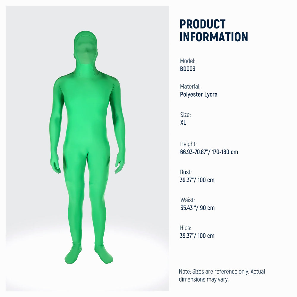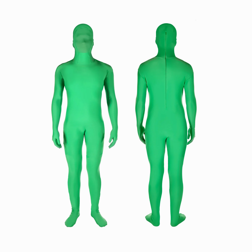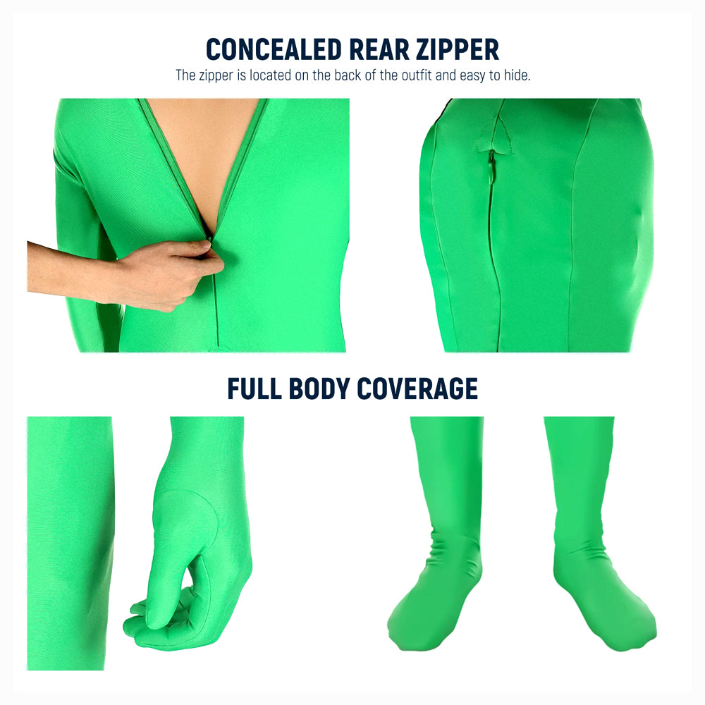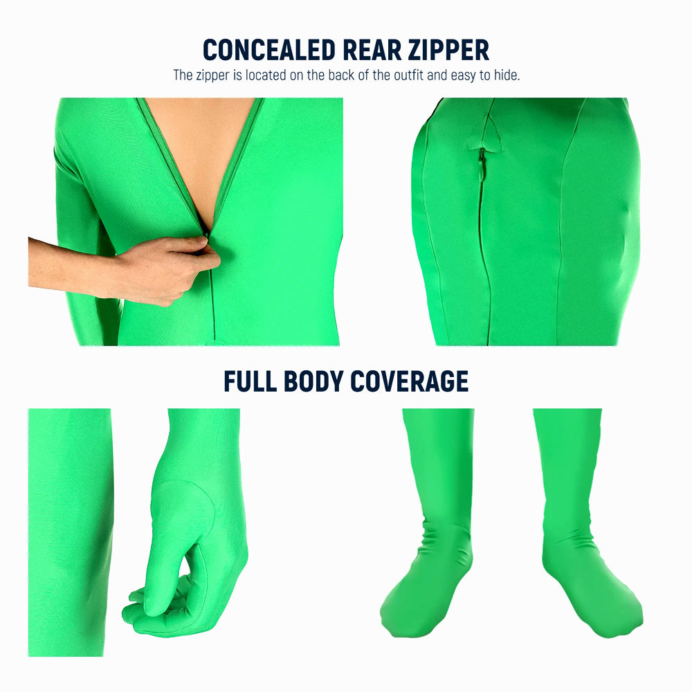 Full Body Chromakey Costume- Achieve flawless invisibility on plain green backgrounds for dramatic special effects. Also versatile as your costume for Halloween, themed parties, cosplay, and more. Compatible with Zentai cosplay Morph bodysuit
