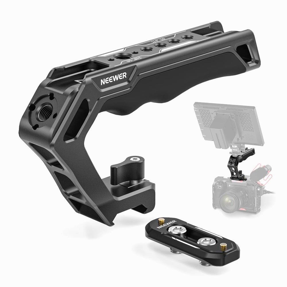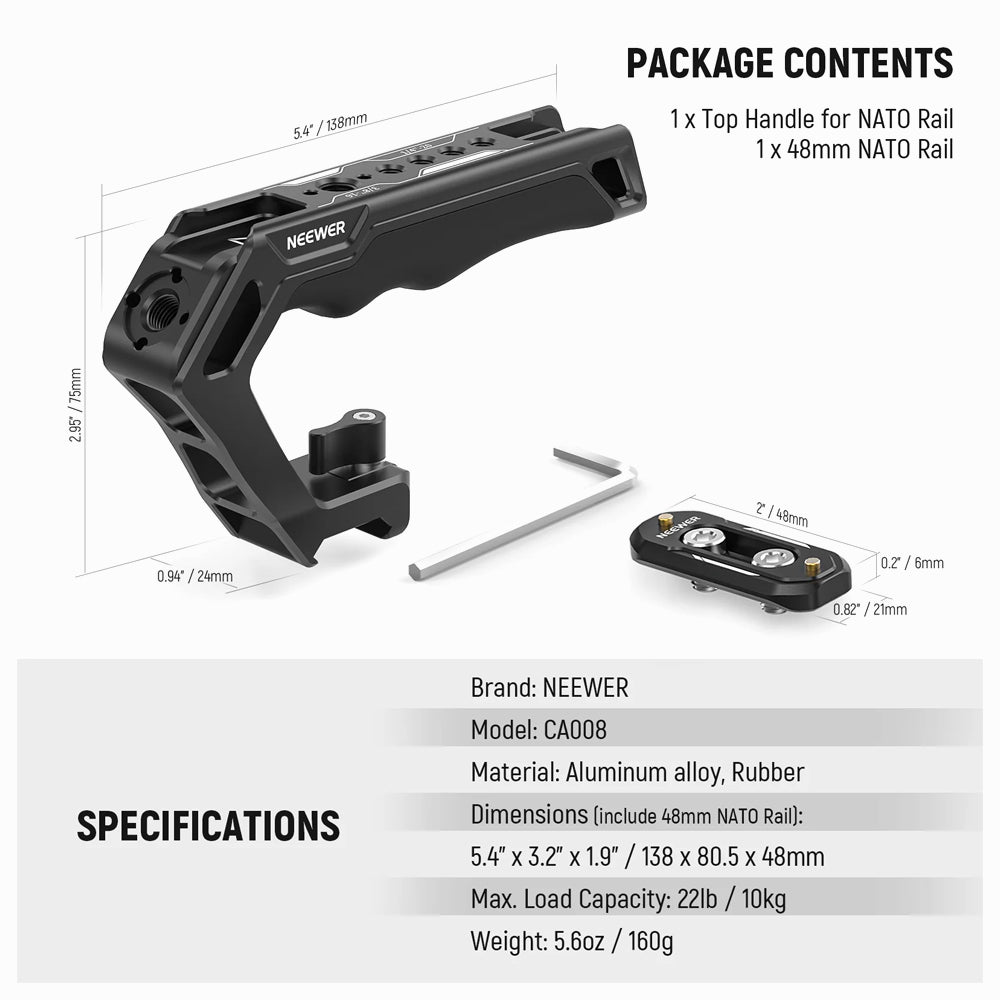 Universal Top Handle with a 48mm NANO Rail- NEEWER CA008 Top Handle is compatible with any NATO Rail and supports free position adjustment. The included 48mm NATO rail can fit on a camera cage via two 1/4" screws (additional NATO rails UA007 75mm and UA022 60mm can be purchased separately) and also features quick release buttons for instant mounting and fall prevention, with a maximum load capacity of 22lb/10kg