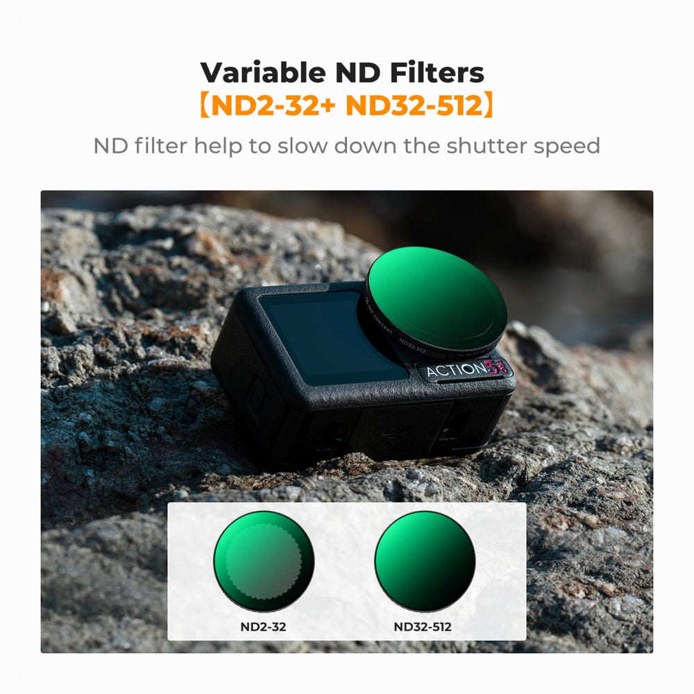 - K&F Concept Variable ND2-32 & ND32-512 Filter Kit Compatible with DJI Osmo Action 5 Pro/Osmo Action 4/Osmo Action 3, (SKU.2359)