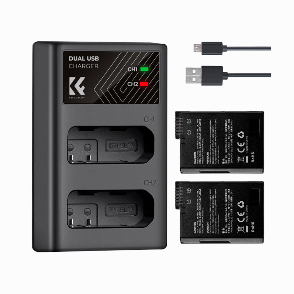 Powerful Battery Capacity: K&F CONCEPT EN-EL14 battery charger set for Nikon EN-EL14 Battery, with two 1050mAh rechargeable batteries and a USB dual slot charger.