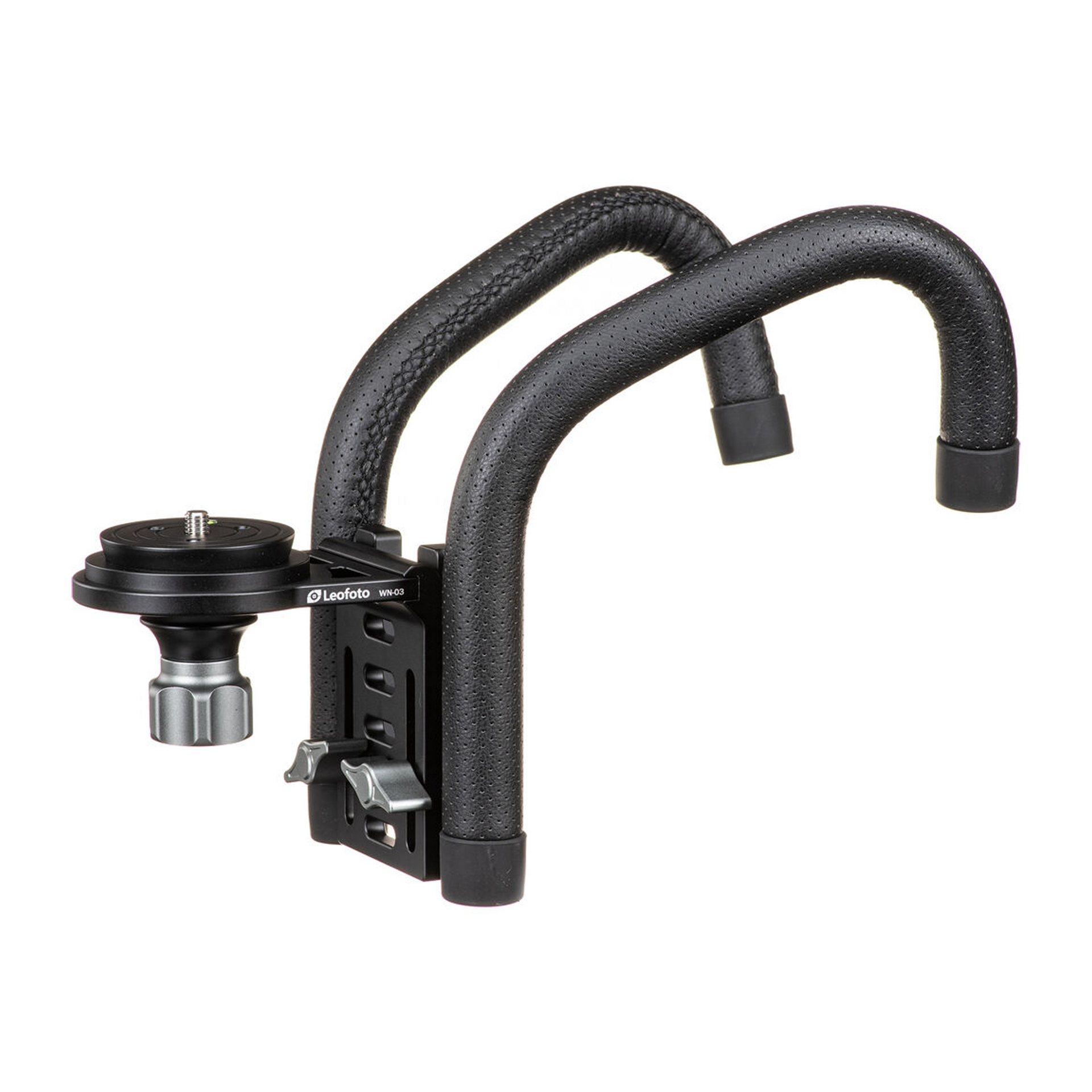 The WN-03 multi-purpose window stabilizer is a versatile, multi-purpose and heavy-duty window mount that offers convenience using equipment around a vehicle. The window stabilizer has a 3/8th mounting stud and features two arms to secure it in place. The arms are made of aluminum, covered with leather, with rubber end caps to protect your vehicle.