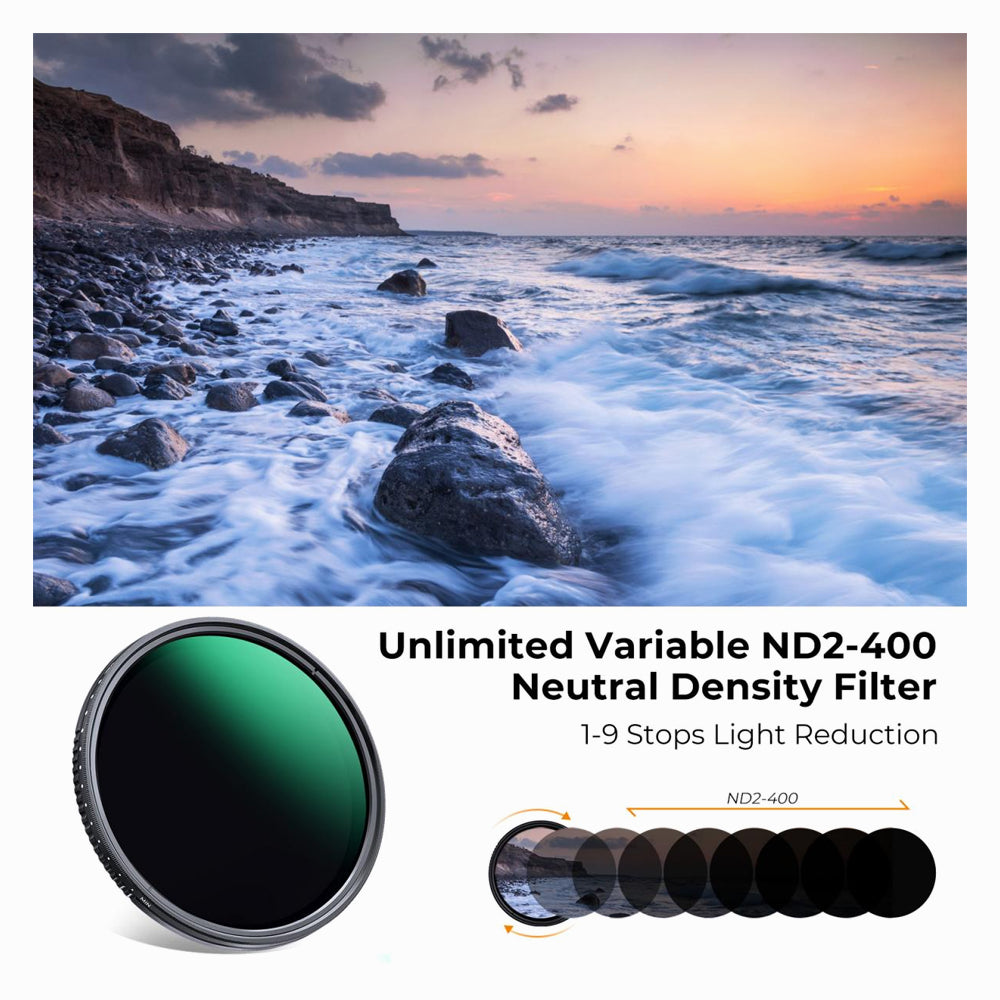 - 【1-9 Stops ND2-ND400 Variable】ND2-ND400 variable filter is intended for long exposure and motion blur techniques in changing light. Reduces light intake from 1 to 9 stops without affecting color balance