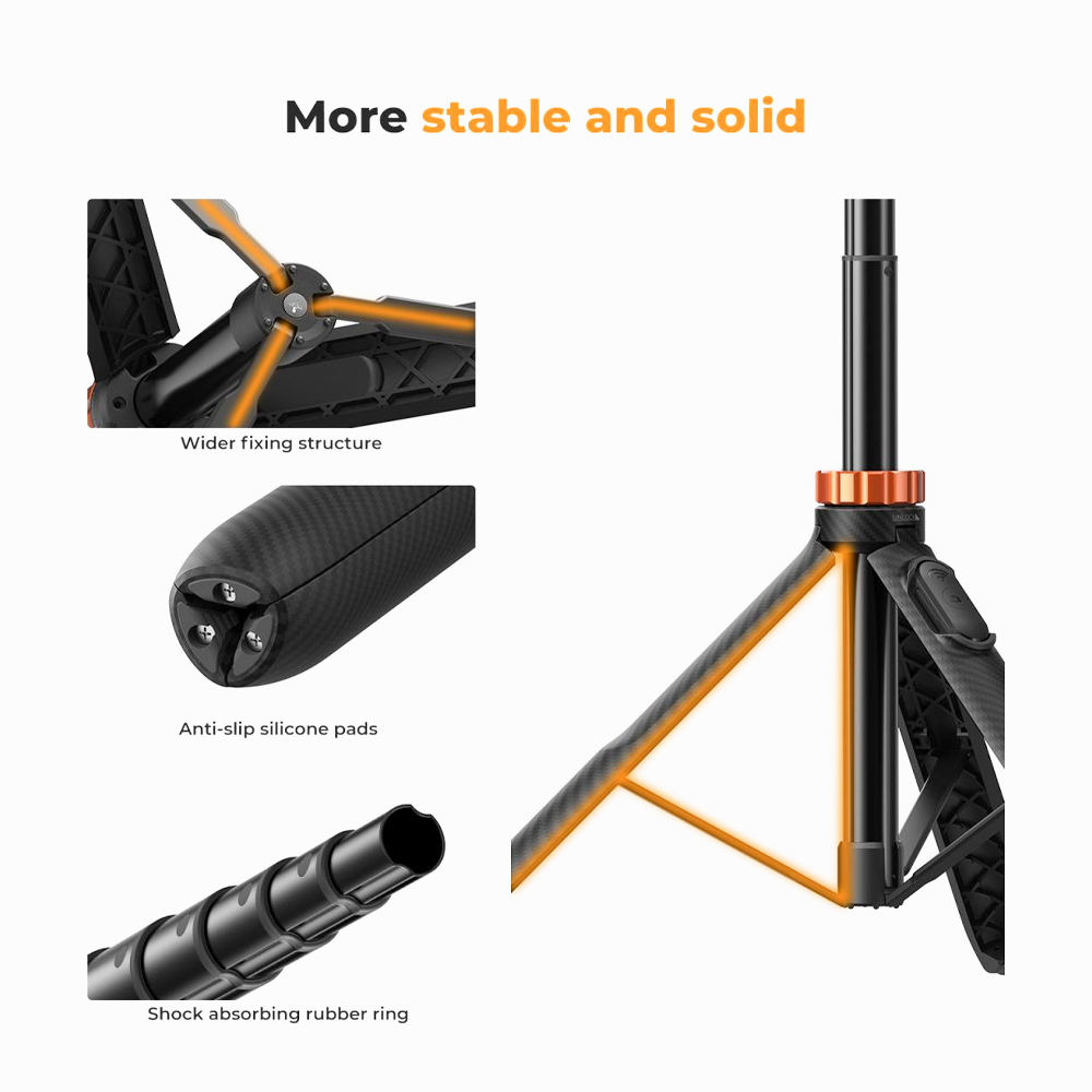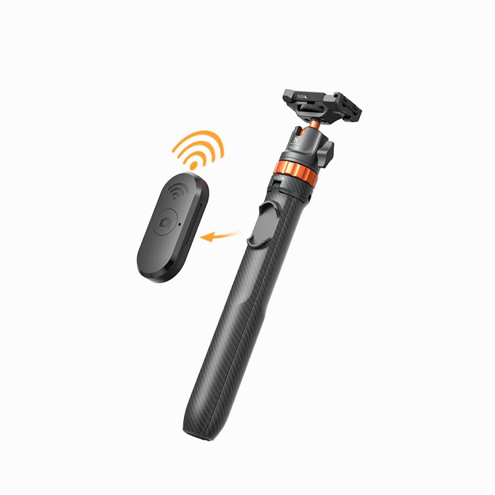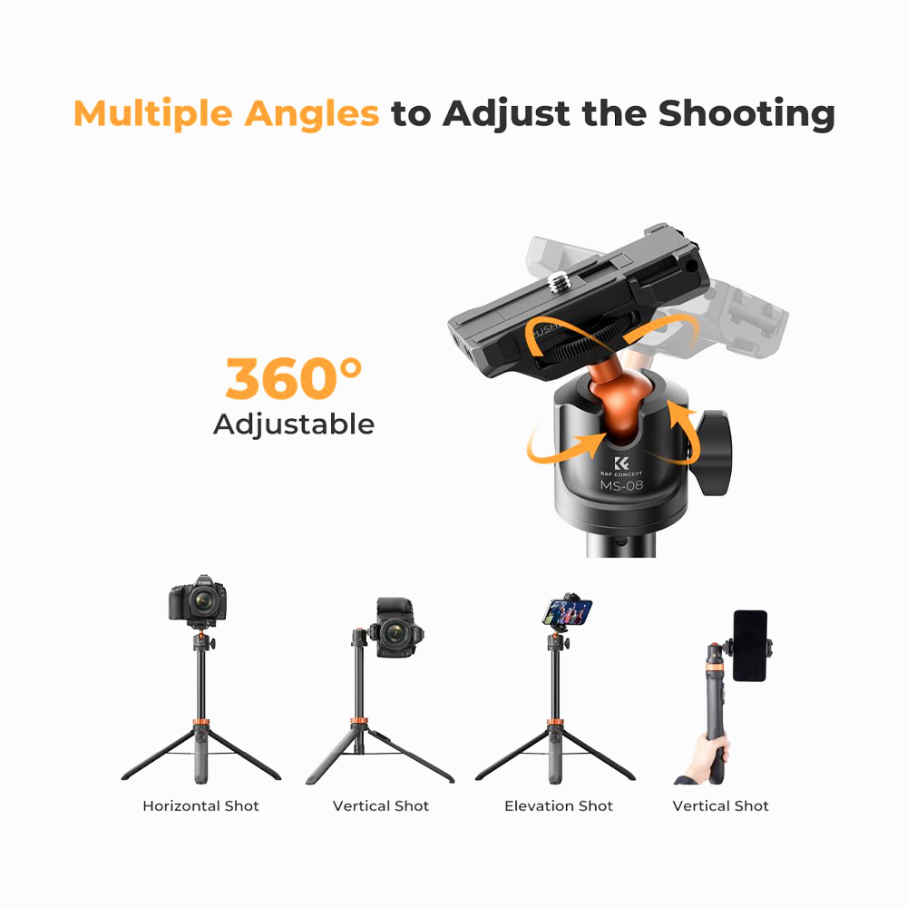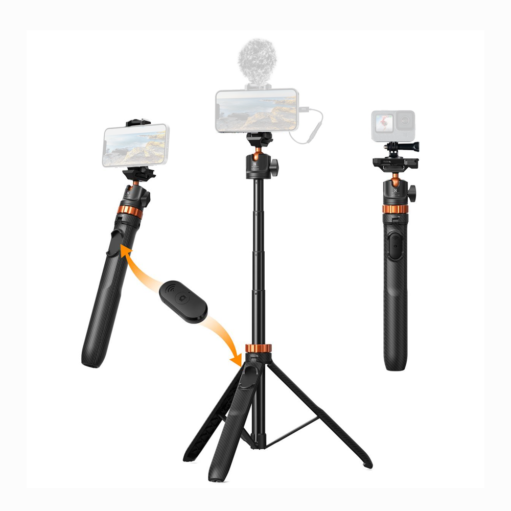 - K&F Concept KF09.127V1Tripod Phone Selfie Stick, Black And Orange With Bluetooth Remote Control + Gopro Adapter MS08