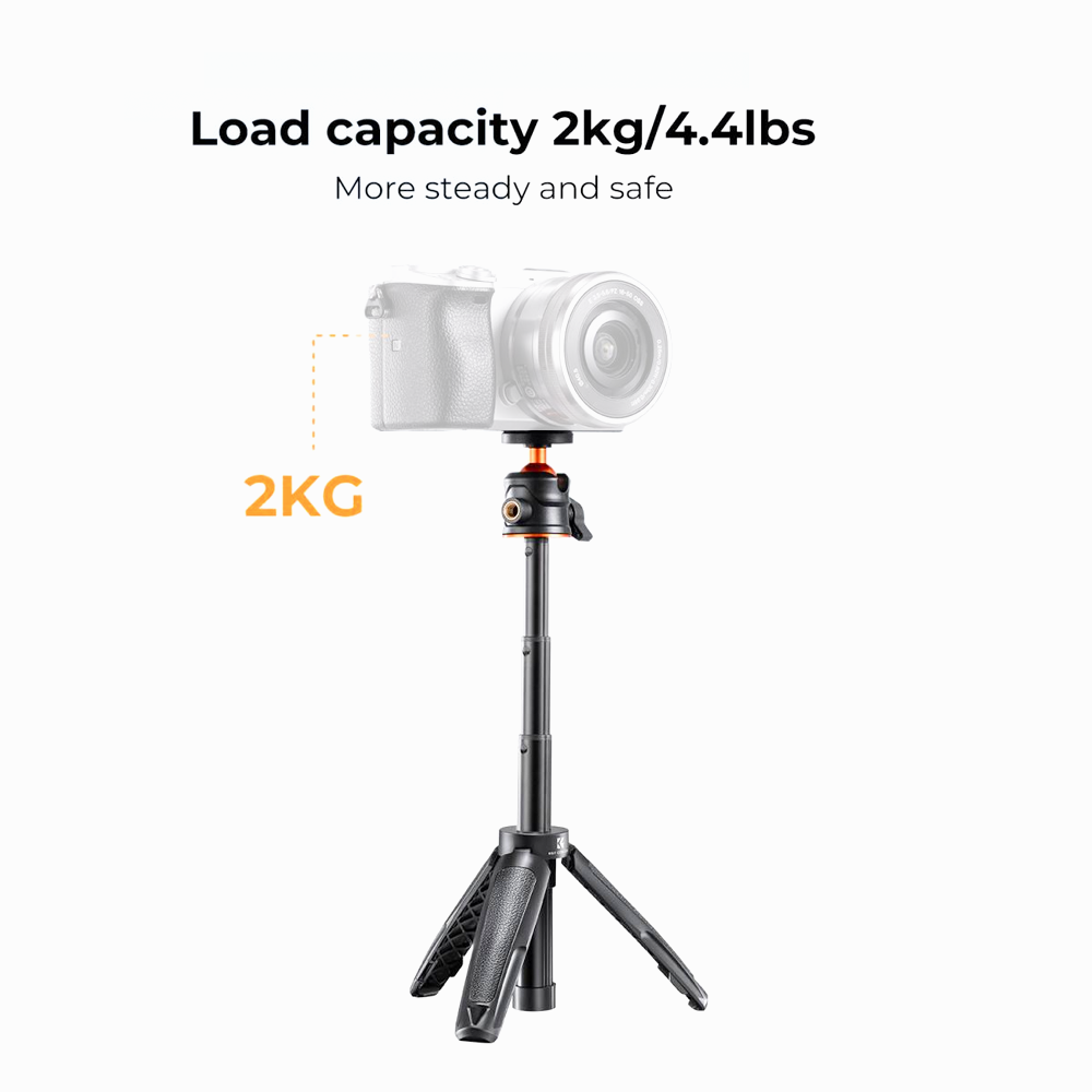 - * The maximum height reaches 34cm, and it supports 5-section leg adjustment, so you can adjust the required height arbitrarily. This tripod head supports a load-bearing capacity of 2kg and is suitable for the needs of most mirrorless cameras, phone tripod with remote and other equipment.