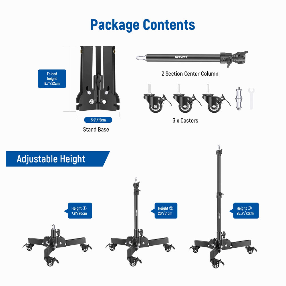 - Adjustable Light Stand- The 2 section center column can be adjusted from 14.5”/37 cm to 22.8”/58cm which makes the total height adjustable from 20"-28.3"/51-72cm. It can be used as a background light stand, or a low angle light stand for photography. You can adjust the height at will