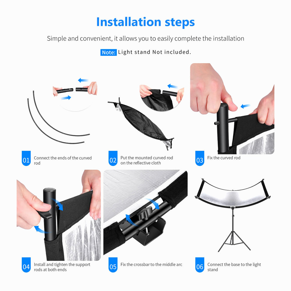 Tool-Free Assembly- Six interlocking curved tubes, two rugged metal rods, and screw knobs enable you to assemble the frame in minutes without any tool needed. The curved tubes and rods can smoothly slip through the rod pockets and stretch the reflector taut