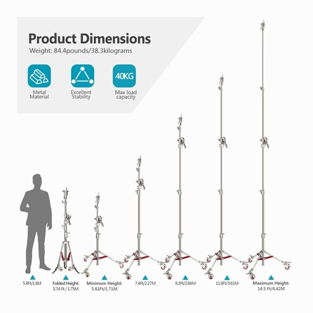- Neewer Pro 100% Stainless Steel C Stand Light Stand with Pulleys, Max. Height 14.4ft/440cm with 7ft/218cm Cross-Bar and Empty Sandbag for Photography Studio Reflector, Monolight and Other Equipment