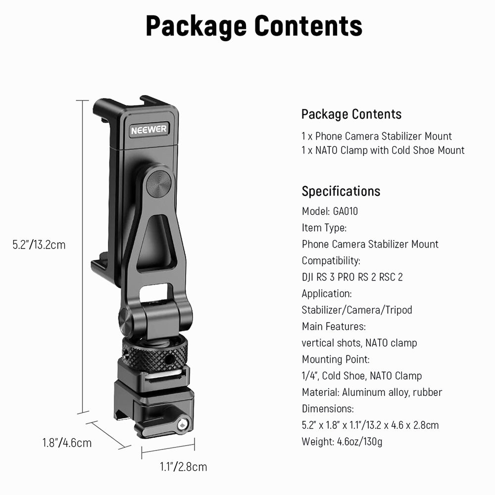 - Neewer GA010 Smartphone Mount with NATO Clamp for DJI RS 3, RS 3 Pro, RS 2 & RSC 2