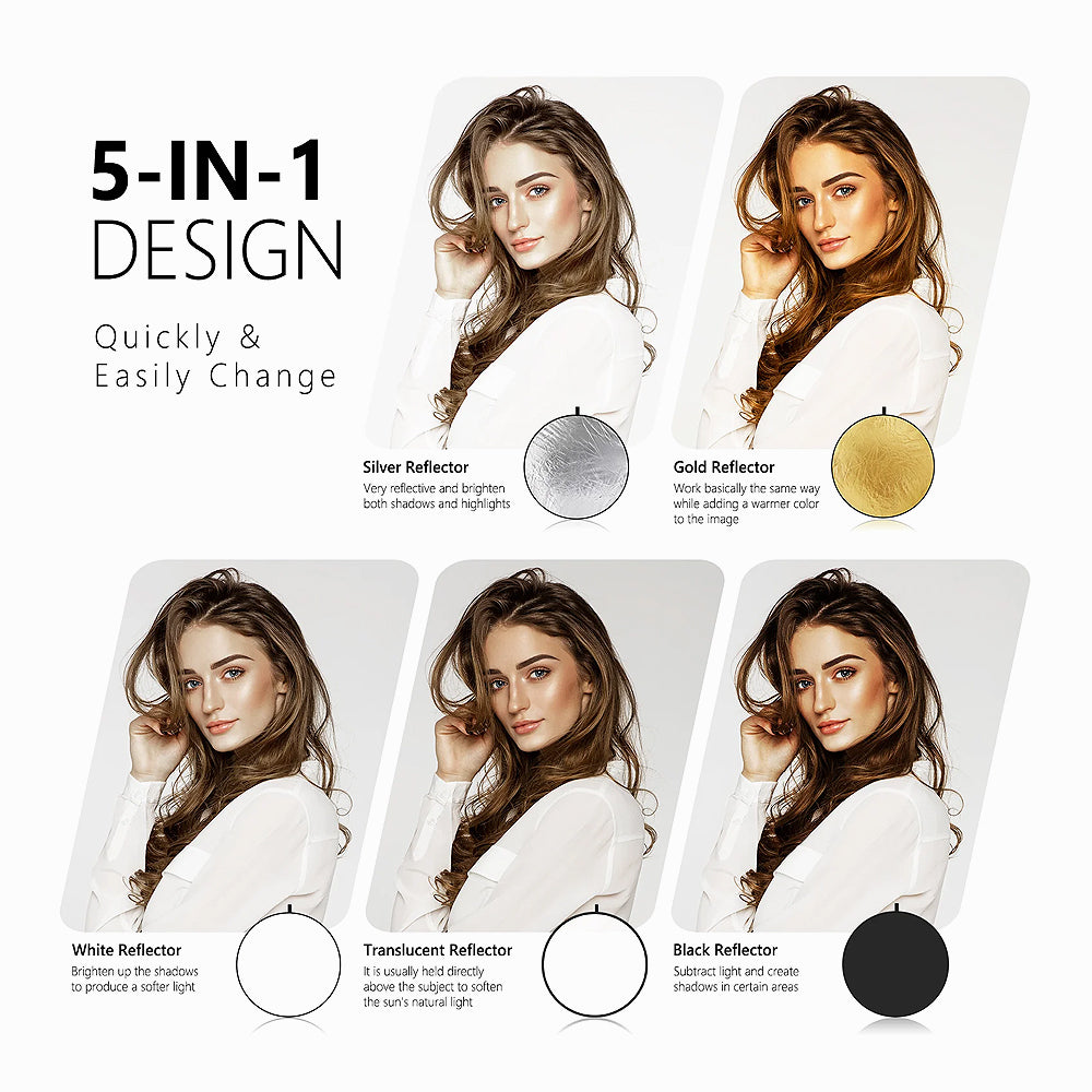 This NEEWER 5-in-1 Collapsible Multi-Disc Light Reflector with Bag Silver Gold White & Black.