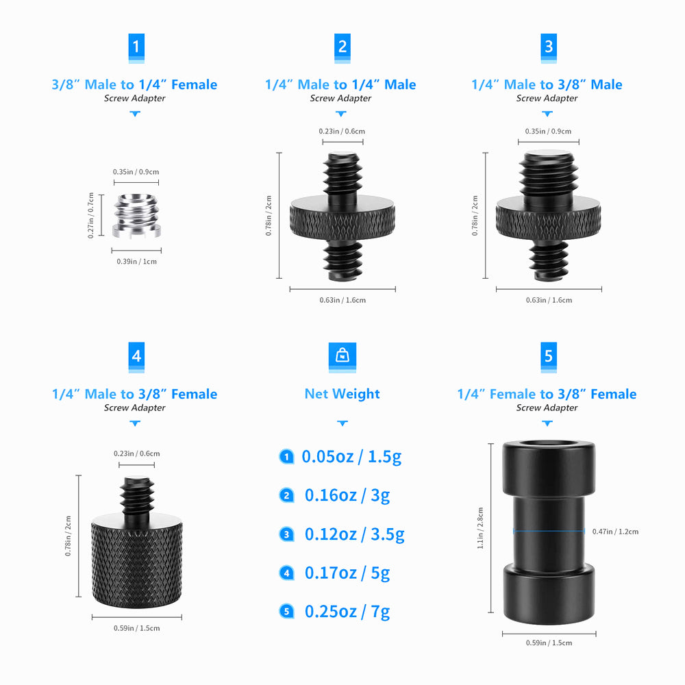 - 5 x 1/4"-20 Male to 3/8"-16 Male