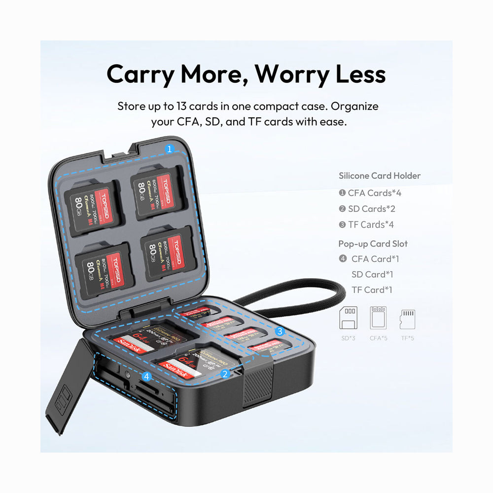 Provides space for up to 13 cards, including CFA, SD, and TF cards, keeping your memory cards organized and protected.