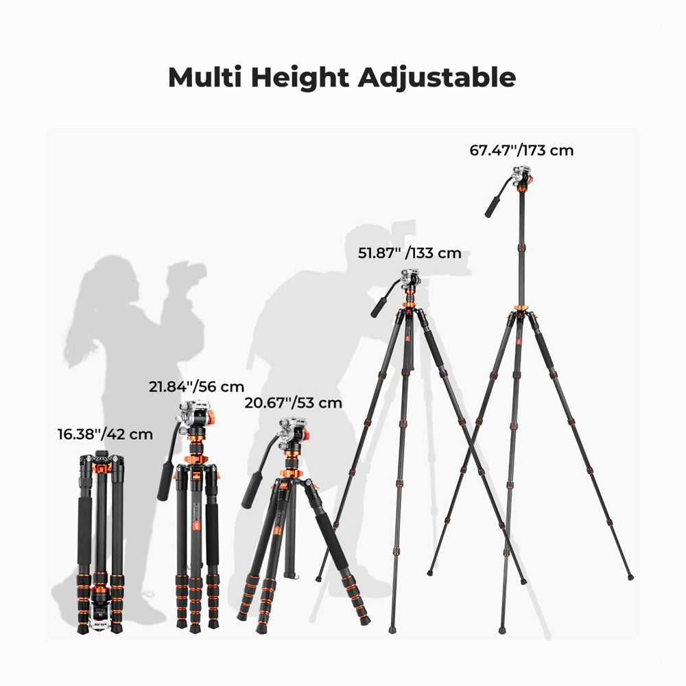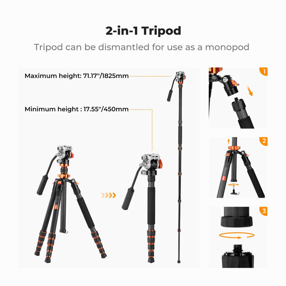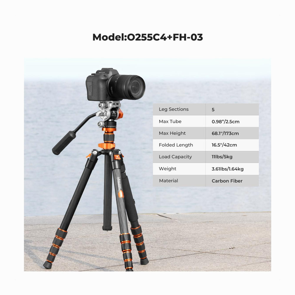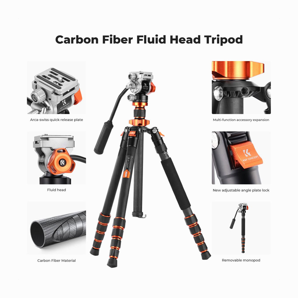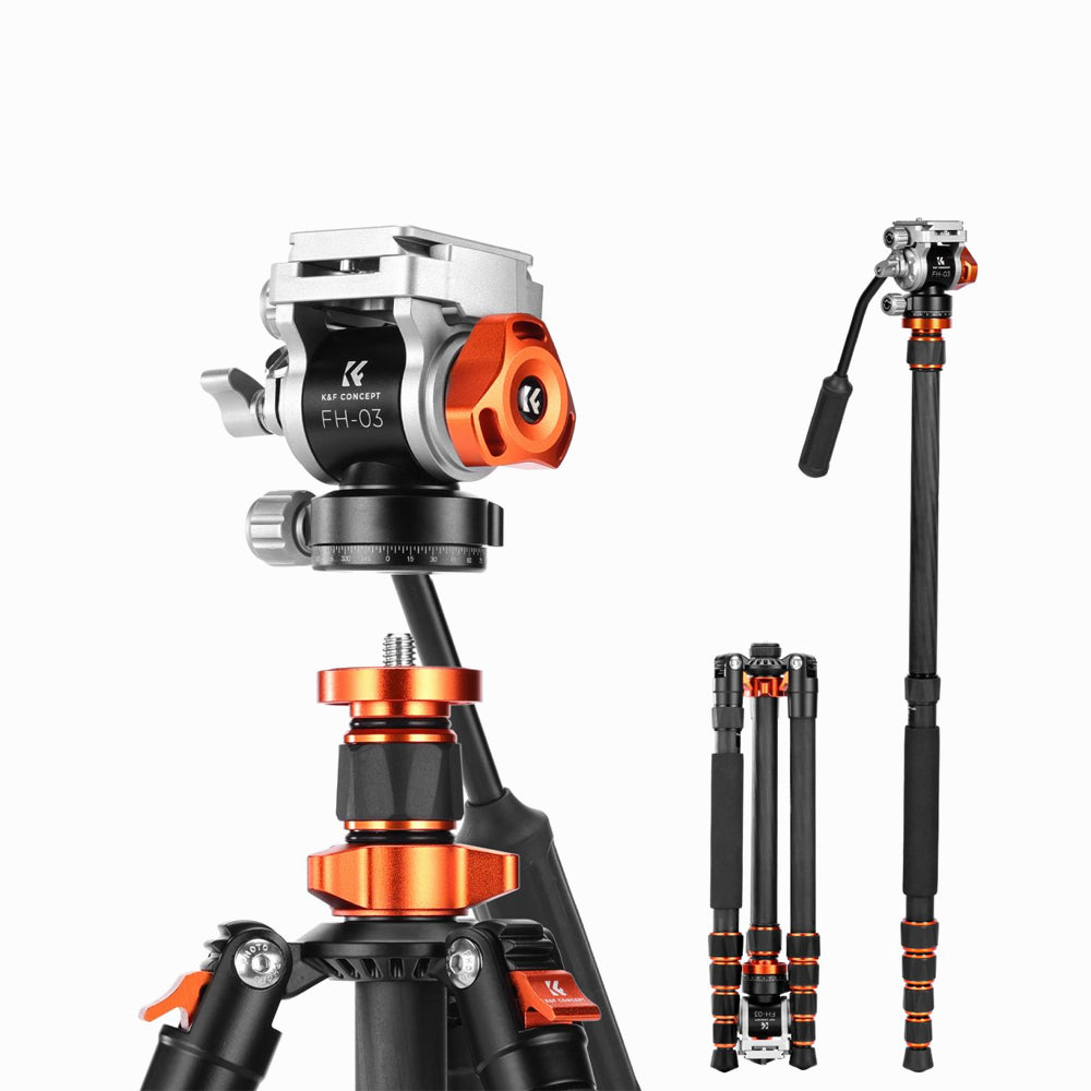 K&F Concept 67"/1.7m Carbon Fiber Lightweight Camera Tripod with Hydraulic Video Tripod Head, Foldable, Detachable Single Leg, Metal Screw Lock, Omni Serie O255C4+FH-03