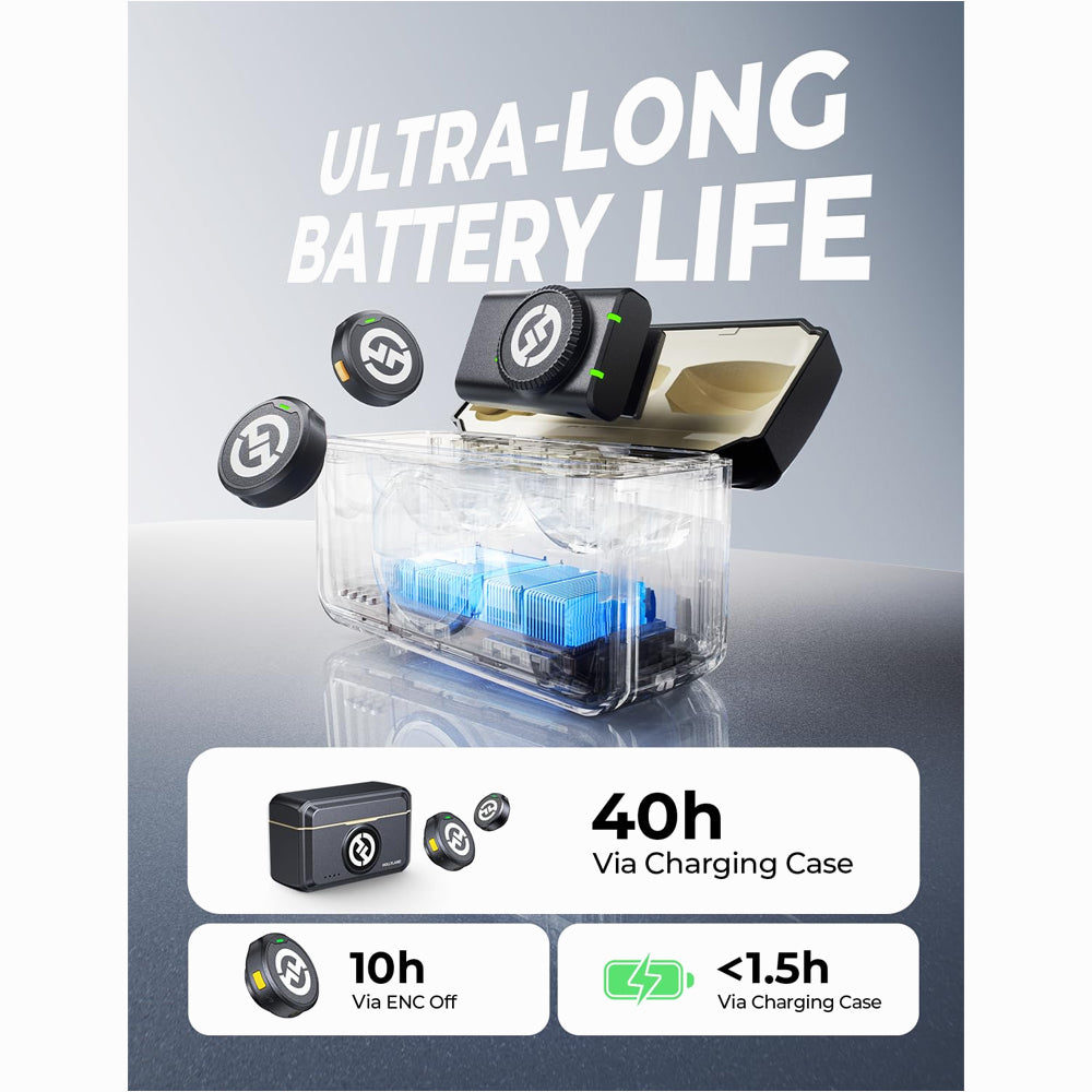 - The charging case is specifically designed to accommodate the camera-mount receiver and two transmitter units. Its 1950mAh internal battery can recharge the entire system three times for a total battery life of 40 hours.