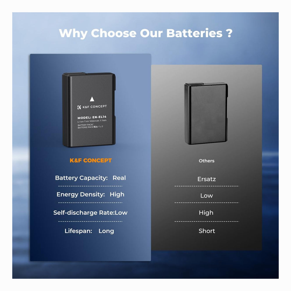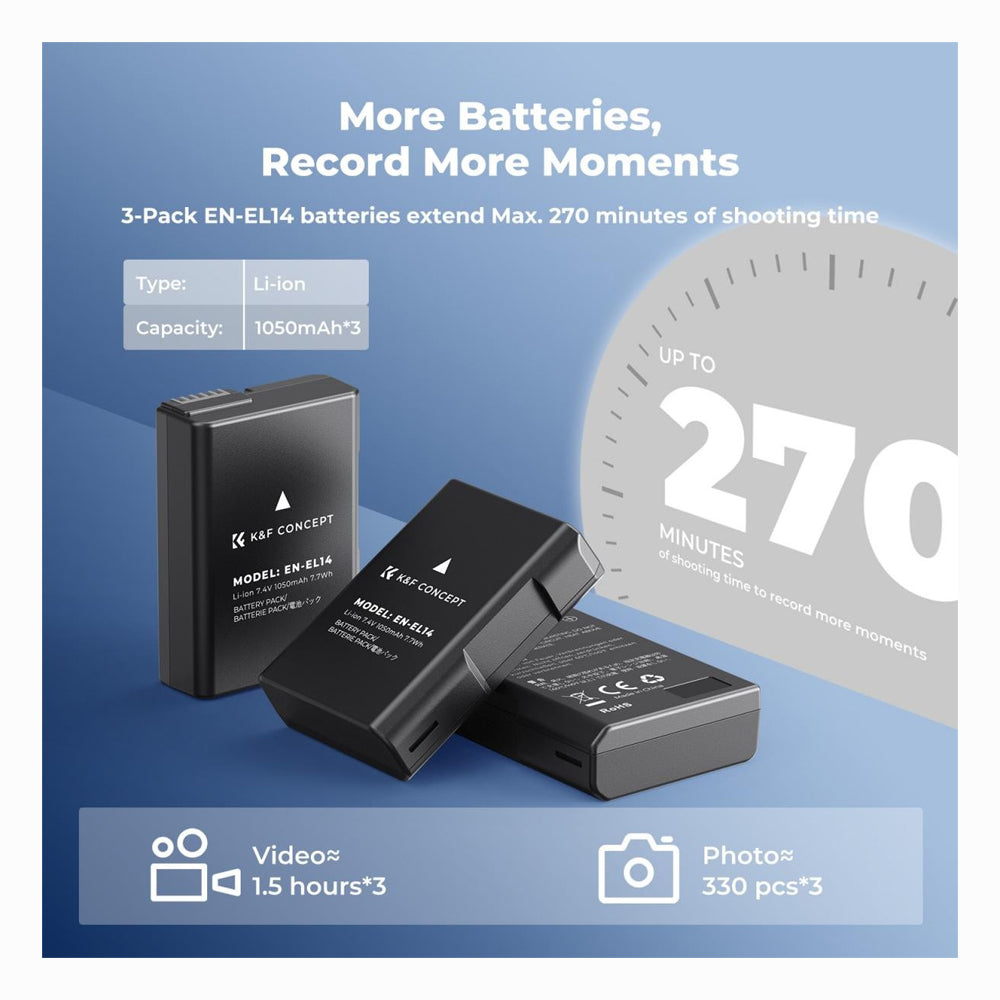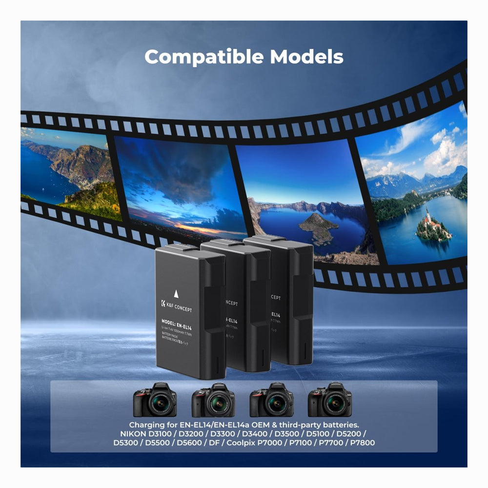 - K&F Concept 3-Pack EN-EL14 Battery LCD Charger Compatible with Nikon D5300 D5600 D5100 D5200 D5500 D3100 D3200 D3300 D3400 D3500 Coolpix P7000 P7100 P7200 P7700 P7800 Cameras SKU: KF28.0100