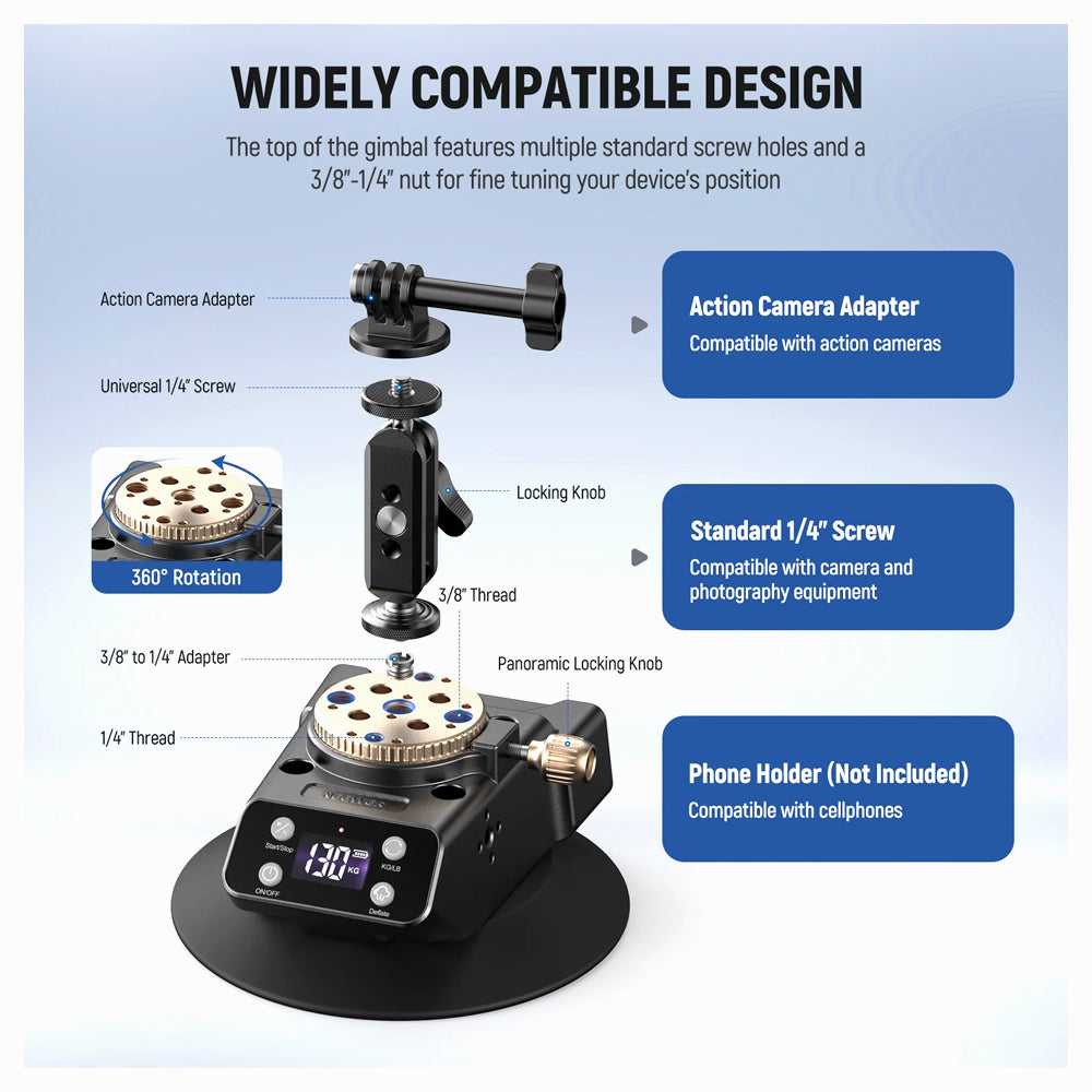 Multiple Devices Supported- The top of the suction cup can be rotated 360°. 1/4" and 3/8" threaded holes can install a variety of equipment and accessories. The ball head magic arm for an extension. The 1/4" thread on the articulating magic arm can connect a vlog camera, DSLR camera, LED light, etc. Includes a mount adapter for action cameras