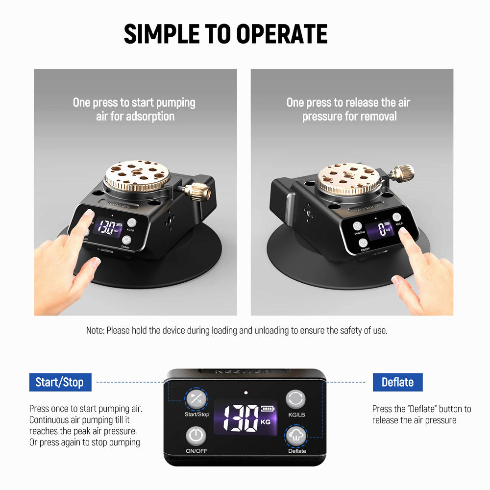 Automatic Air Pump- If the vacuum pressure falls below 90kg, the pump will automatically start until the vacuum pressure is restored. It will stop extracting air when it reaches 130kg. The suction cup stays stable and firm all the time. Note: Please pay attention to the suction force of the display