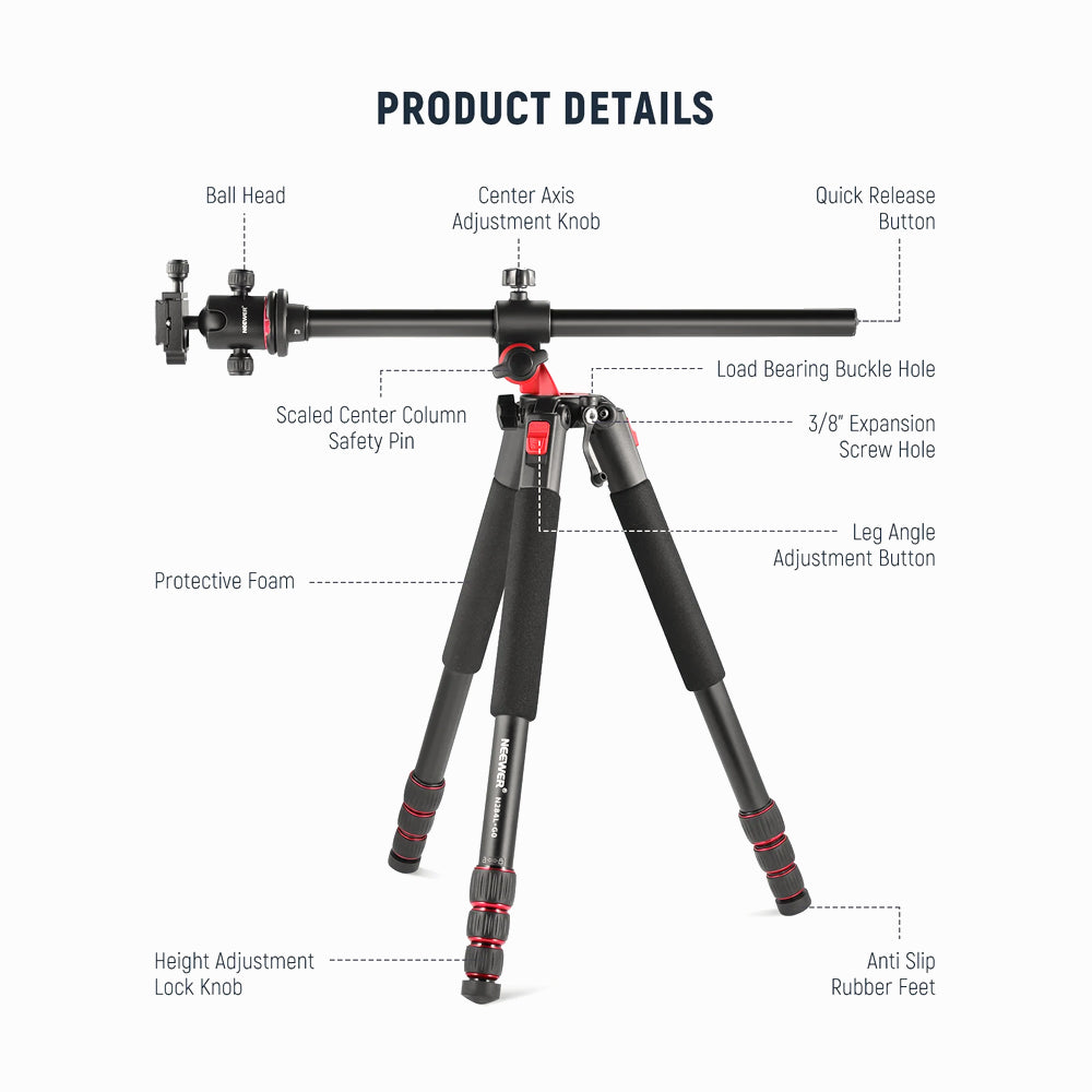 - Transform Into Monopod- One of the tripod leg tubes can be quickly disassembled and connected with the central column to transform into a monopod, providing an alternative way of shooting; The height of the monopod is adjustable from 21.7" to 61"/ 55cm to 155cm