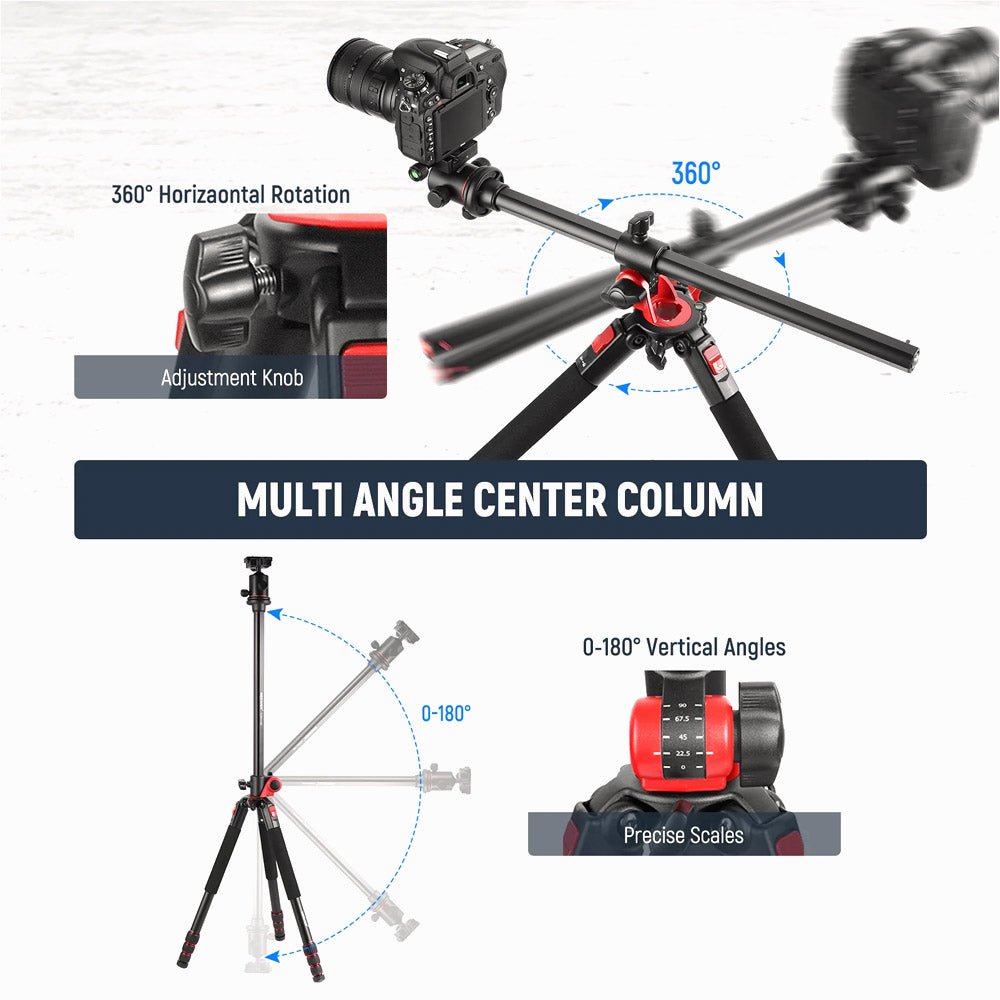 - Upgraded Design- The central column can be used vertically (at 0 /22.5 /45 /67.5 /90 Degree) or horizontally (360 Degree rotation) so that photographers can easier realize panoramic, low angle and macro shooting; 4 section legs with quick release twist locks allow you to adjust the working height from 26.4" to 78.7"/67cm to 200cm in seconds; Note: The calibration line must be aligned to be locked or the column can not be stable
