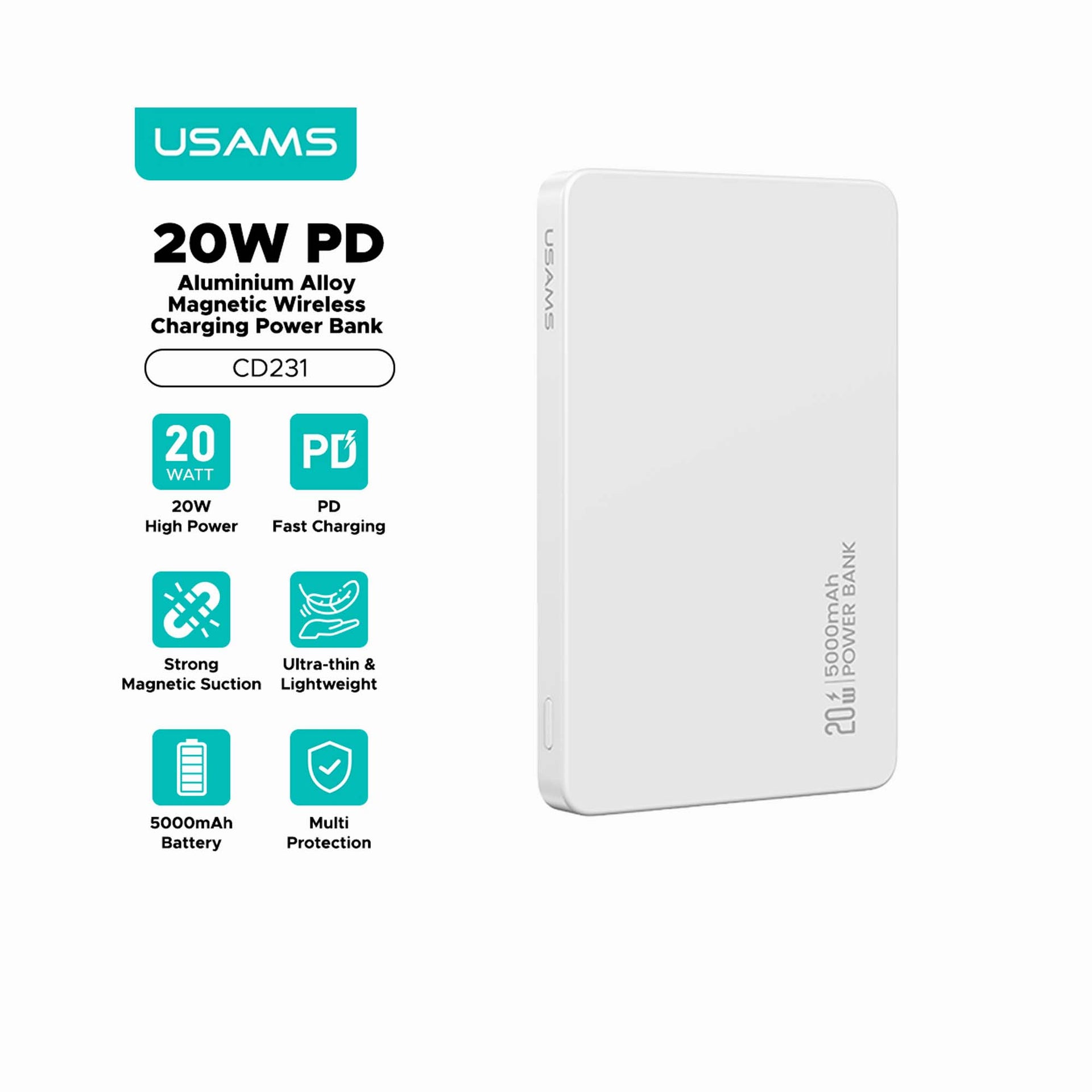 - USAMS CD231 Portable Charger PD 20W Magnetic Wireless Power Bank 5000mAh Slim Battery Pack Charger - White
