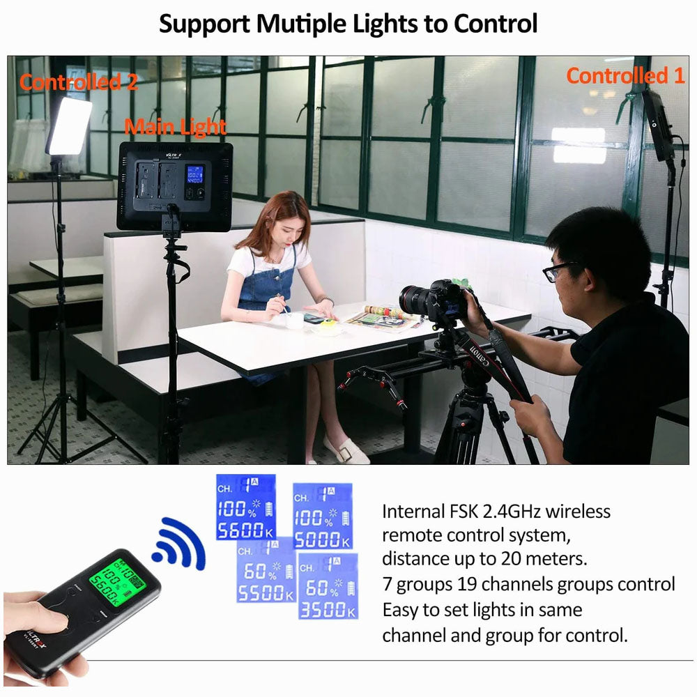 The VL-200T also features a six-group, nineteen-channel RF wireless remote system. The included wireless remote allows you to control one or more lights from a distance of up to 20 meters. It allows you to view and control color temperature, brightness, and lighting group settings.